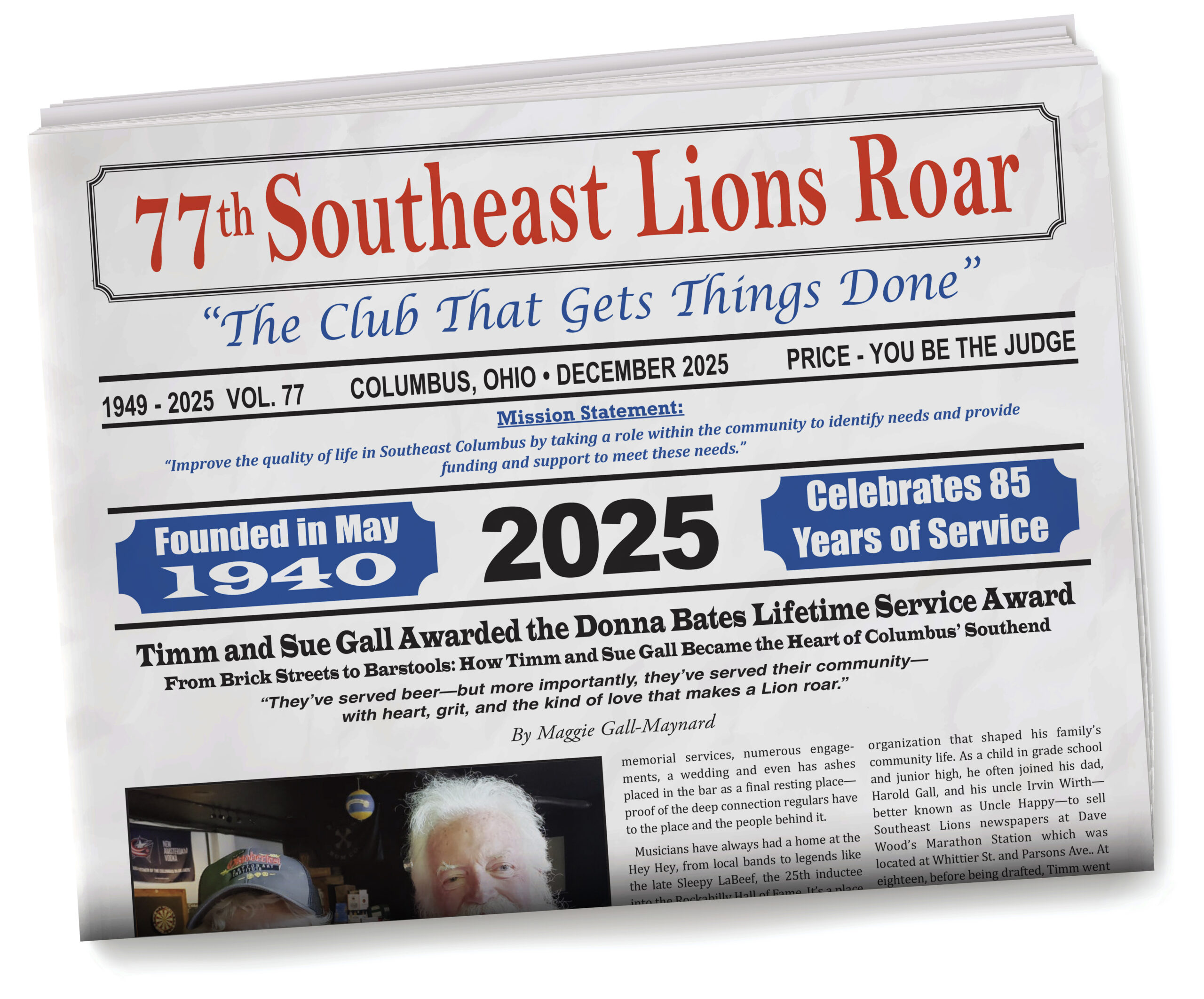 Since 1949, The Southeast Lions Club has published our annual report, “The Southeast Lions Roar — Good Newspaper” to our community providing information about the many projects completed in Southeast Columbus. We thank all who support our paper with advertising and donations so that projects are possible, benefitting this community. The Southeast Lions Club is proudly “The Club That Gets Things Done” thanks to you, our community!