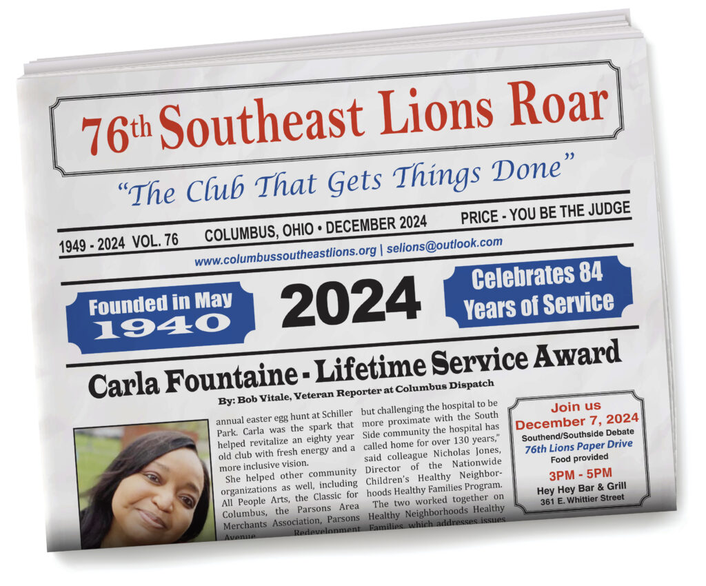 Since 1949, The Southeast Lions Club has published our annual report, “The Southeast Lions Roar — Good Newspaper” to our community providing information about the many projects completed in Southeast Columbus. We thank all who support our paper with advertising and donations so that projects are possible, benefitting this community. The Southeast Lions Club is proudly “The Club That Gets Things Done” thanks to you, our community!